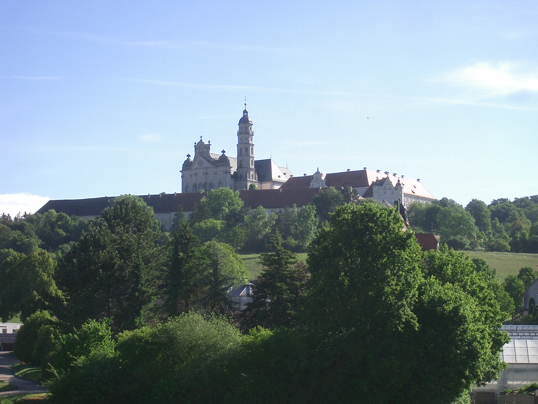 Vom Weg aus Neresheim sieht man noch lange Zeit das Kloster auf der Anhöhe.